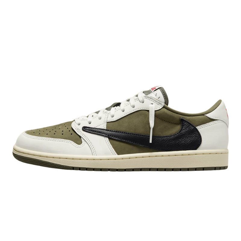 - Travis Scott Jordan 1 Low Medium Olive – subtle olive tones with reversed Swoosh